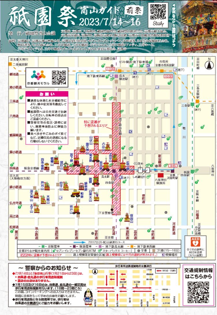 祇園祭(前祭)の山鉾巡行参加町会をめぐりつつ祇園祭全般についてご案内いたします。